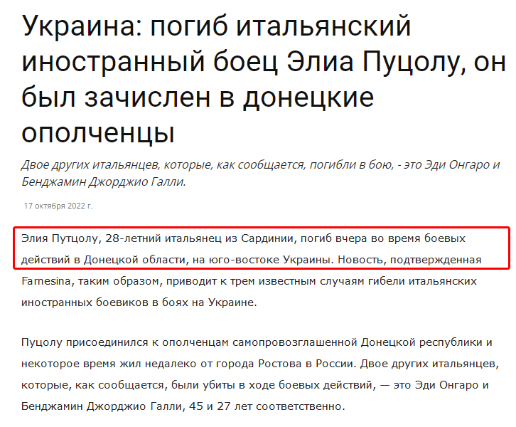 11 hours agoSi chiamava Elia Putzolu ed era originario della Sardegna il giovane foreign fighter di 28 anni morto ieri in combattimento nel Donetsk. Il primo è stato Edy Ongaro militante nelle fila dei separatisti filorussi del Donbass ucciso lo. 9 hours agoSi chiamava Elia Putzolu il giovane di 28 anni di origine sarda ucciso in combattimento nella Repubblica autoproclamata Donetsk in Ucraina.